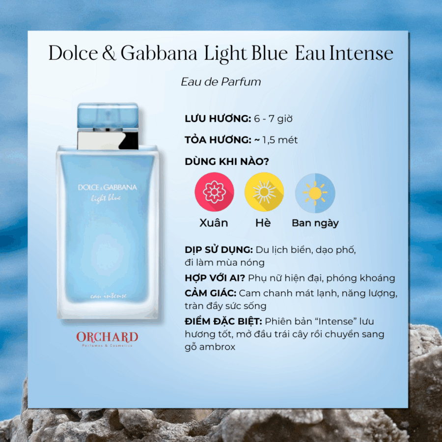 Từ khi ra mắt đến nay có thể thấy, Dolce & Gabbana Light Blue Eau Intense EDP được yêu thích nhờ sự mát lành, dễ chịu nhưng vẫn bám mùi tốt, rất phù hợp với khí hậu nóng ẩm. Mùi hương không phô trương nhưng thanh lịch, sạch sẽ và dễ gần khiến nhiều người xem đây là lựa chọn an toàn cho cả công sở lẫn dạo phố. Chính độ tươi mát ổn định cùng cảm giác “dễ chịu mọi hoàn cảnh” đã giúp nó trở thành chai nước hoa mùa hè được ưa chuộng bền bỉ qua thời gian.