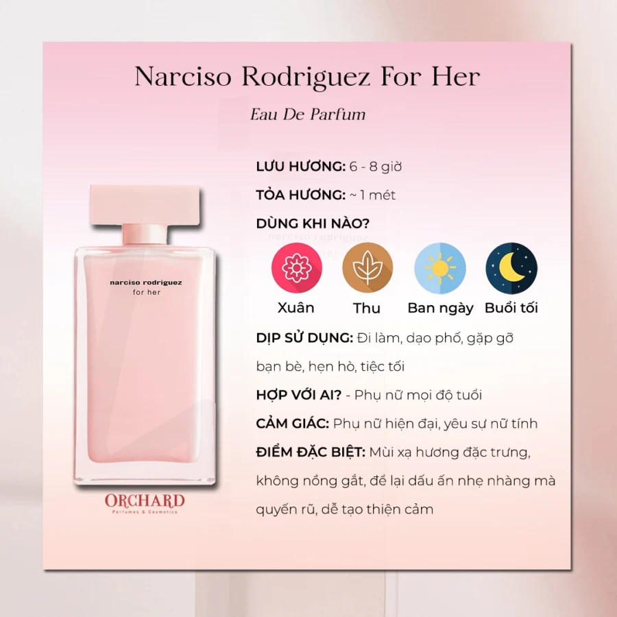 Ra đời năm 2006 bởi hai nhà chế tác tài hoa Christine Nagel và Francis Kurkdjian, Narciso Rodriguez For Her EDP nhanh chóng trở thành lựa chọn ưa thích của những người phụ nữ hiện đại: nữ tính, tinh tế và luôn muốn giữ cho mình một nét quyến rũ kín đáo nhưng không kém phần khác biệt.